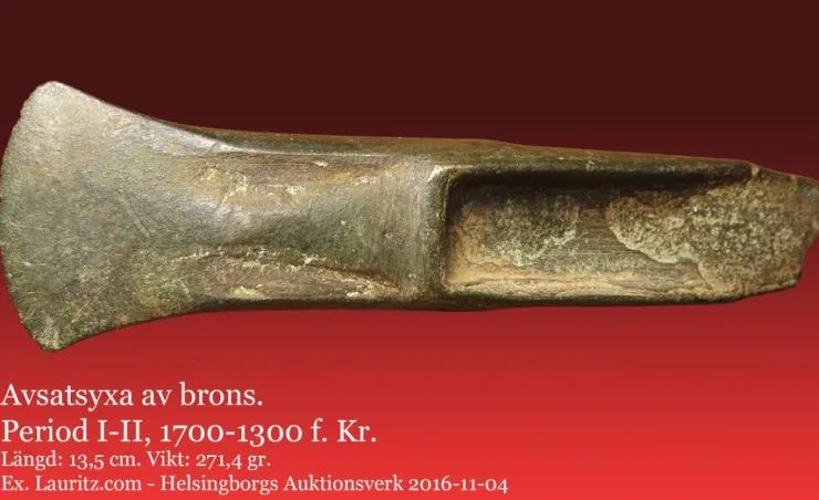 En mycket trevlig avsatsyxa av brons från äldre bronsåldern. Yxan är i mycket bra skick och har en fin grön patina. Denna typ av föremål var bland de första metallföremål som tillverkades i Norden och representerade ett mycket stort värde. Självklart garanterat äkta.