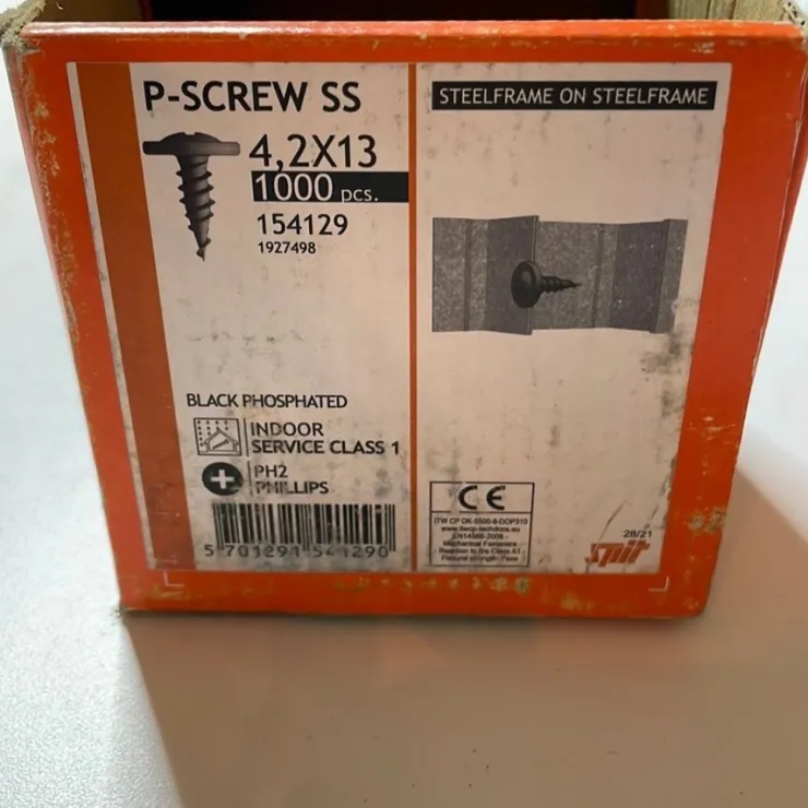 P-skruer i størrelsen 4,2×13 mm. De er lavet af rustfrit stål og har en sort fosfateret overflade. De er velegnede til indendørs brug og har en indvendig serviceklasse 1. De har en PH2 Phillips-kors.