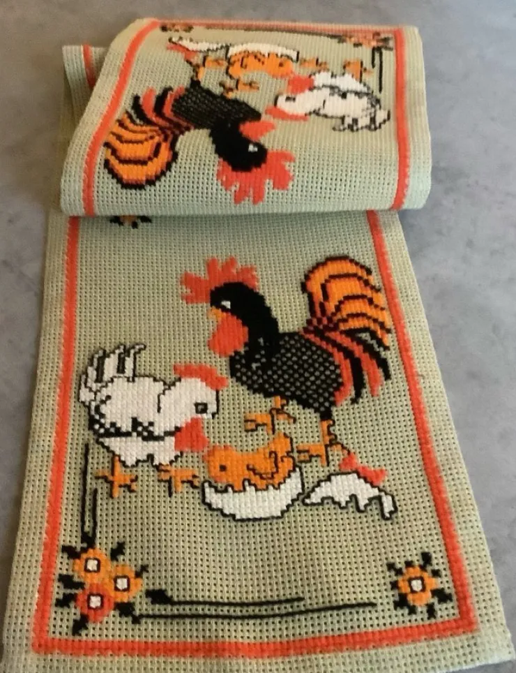 Äldre Handarbetad bordslöpare med ett motiv av hönor, kycklingar och tuppar. Passar fint till exempelvis köksbordet till påsk