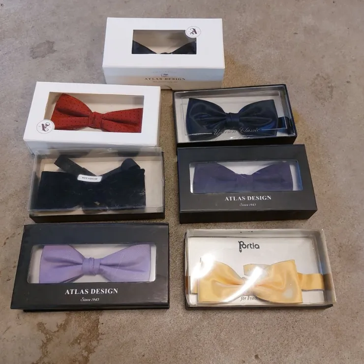Paket med åtta nya flugor i olika färger och mönster. Flugorna är oanvända och kommer i sina originalaskar. Bland märkena finns Atlas Design och Portia.