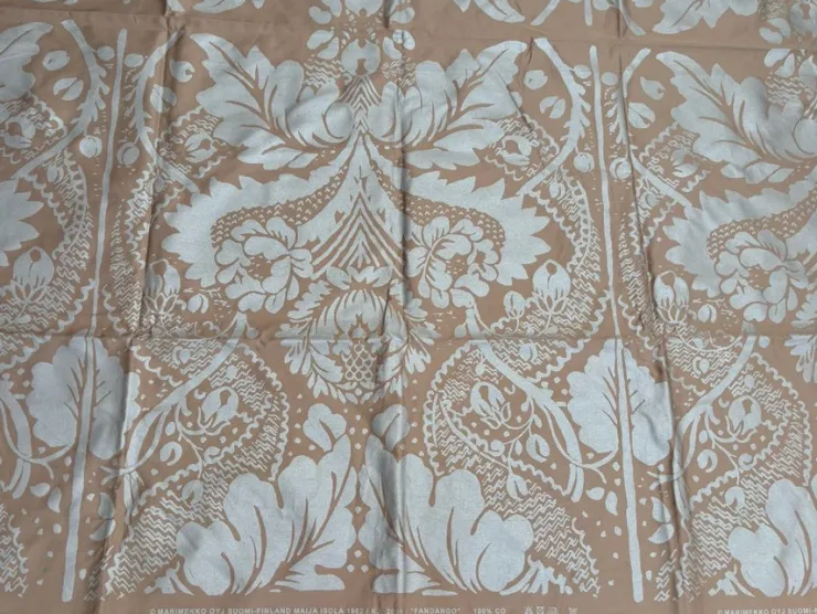 Designtyg av Maija Isola. Beige/ljusbrunt med silvertryck.