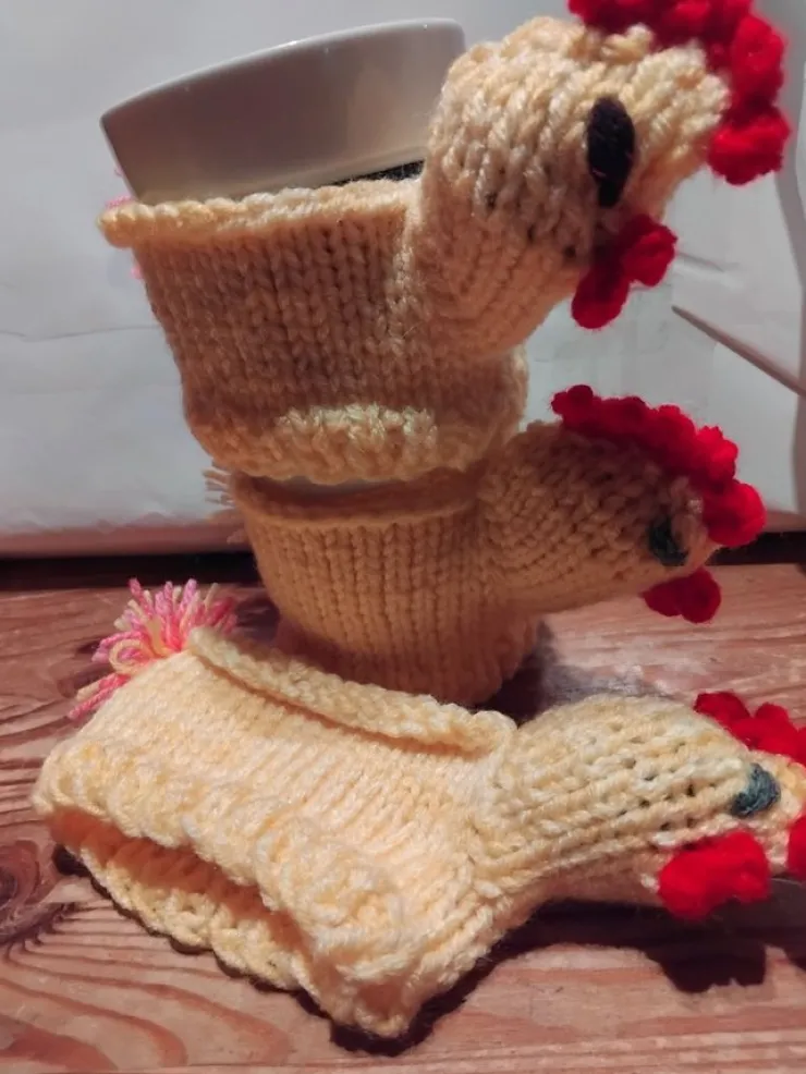 17 st Snygga och handgjorda muggvarmare stickade i kycklingdesign. Satsen innehåller flera varmare i både gul och rosa. Perfekta för att hålla dina drycker varma och samtidigt addera en rolig touch till din kaffestund.