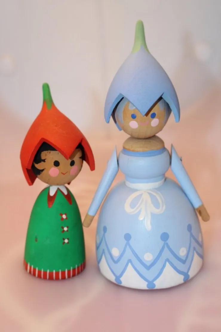 Två mycket rara små flickor i trä med "blomhatt" på huvudet. Den ena är märkt Hemslöjden Borås. De är i fint skick, men jag tror att den lilla haft en blomma eller något liknande vid det lilla hålet som syns på första bilden, ungefär mitt på kroppen, och den blå har kanske hållit något i sin vänstra hand. Men de är lika söta ändå! De är 15 och drygt 11 cm höga.