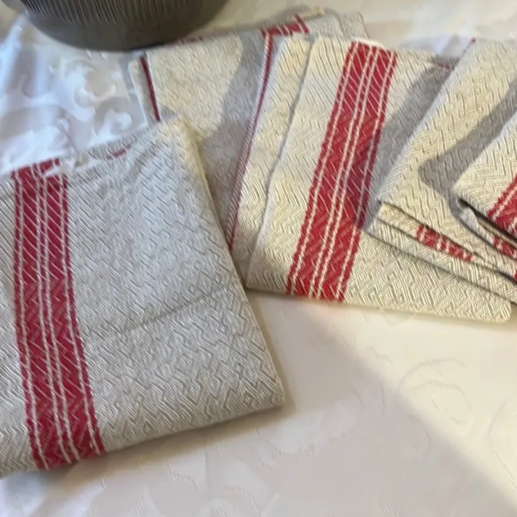 Sex fina kökshanddukar i linne med röda ränder. Handdukarna är i beige/naturvit färg med ett fint mönster. Perfekta för att ge köket en lantlig känsla.