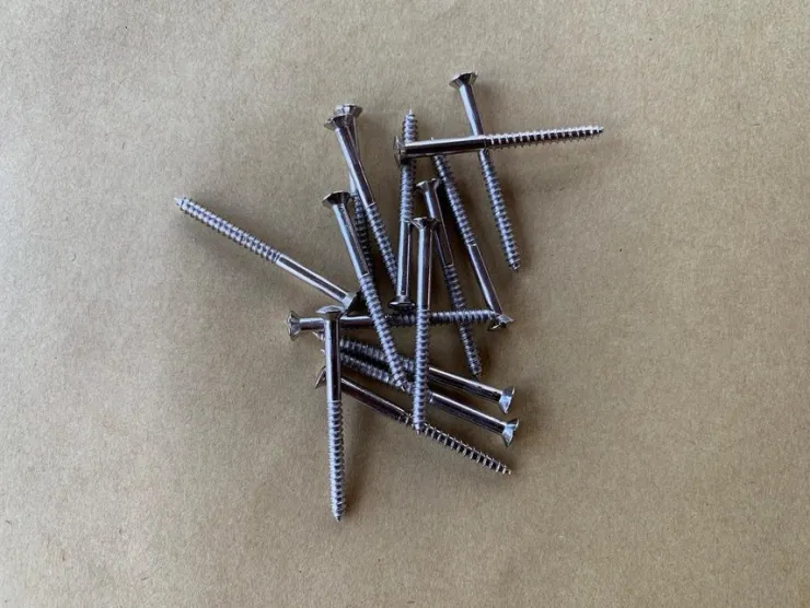 Forniklet messing skrue af ægte massiv messing med kullerforsænket sporhoved. Skruen kommer fra en gammel nedlagt jernvarehandel.