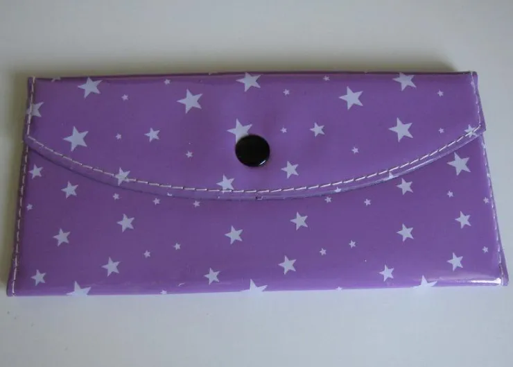 Plånboken är 18 x 9 cm stor, går att veckla ut till 23 cm bred.