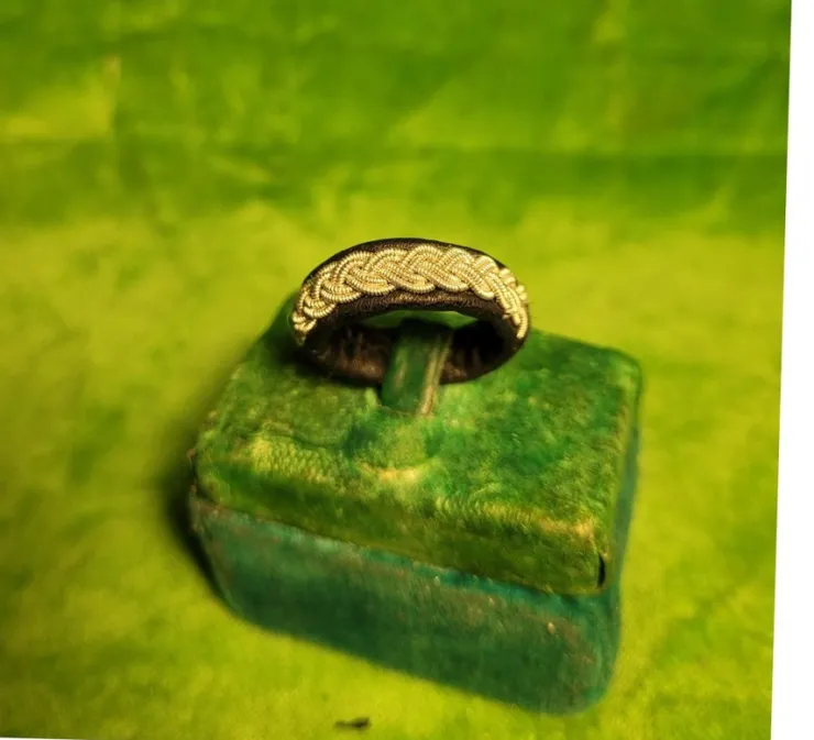 Skäm bort din kära, med en fin handsydd ring av svart skinn, broderat med en fläta av tenntråd.