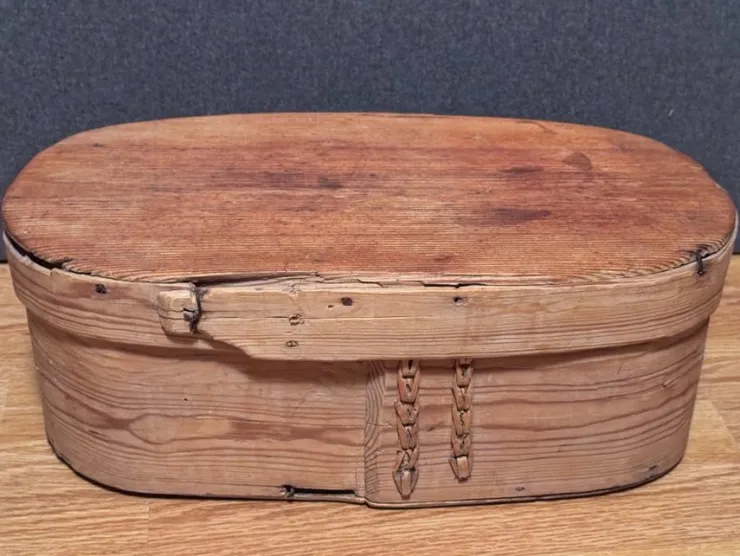 En gammal oval träask med lock. Asken är tillverkad av trä och har en enkel design. Den är perfekt för förvaring av småsaker eller som en dekorativ detalj i hemmet.