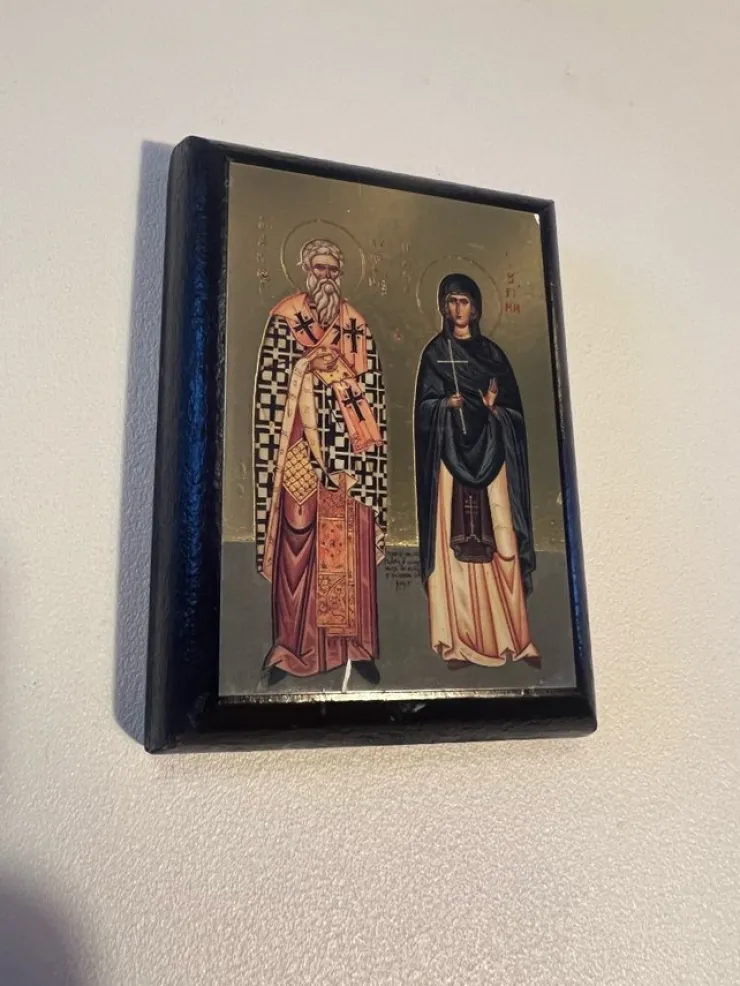 Ikon med motiv av helgonen Kyprianos och Justina. Ikonens mått är ca 9×6,5 cm.