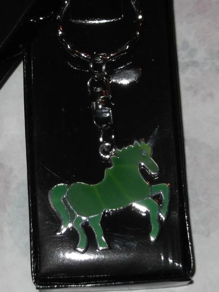 Vacker nyckelring i form av en grön enhörning, från Pollux hästbokklubb