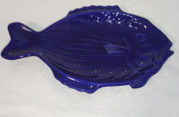 Blå fiskformad serveringsfat i keramik. Perfekt för att servera snacks, tillbehör eller som en unik dekoration.