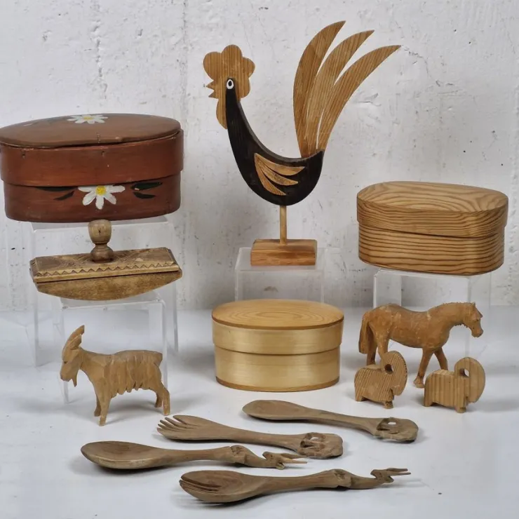 Parti träföremål – Burkar, figuriner & redskap, mm. i trä – 1900-tal – Vintage