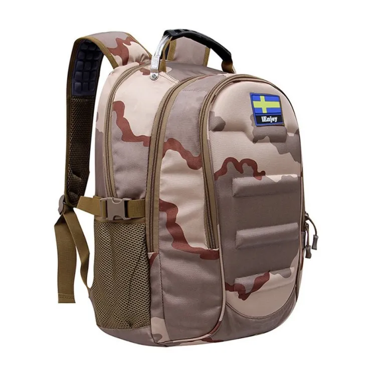 Ryggsäcken är gjord av slitstark tyg och sluts med dragkedjor.