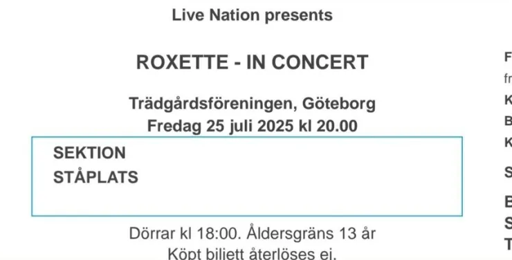 Säljer 2 biljetter till Roxettes utsålda konsert i Göteborg fredag den 25 juli 2025. Konserten hålls i Trädgårdsföreningen och erbjuder bara ståplatser.