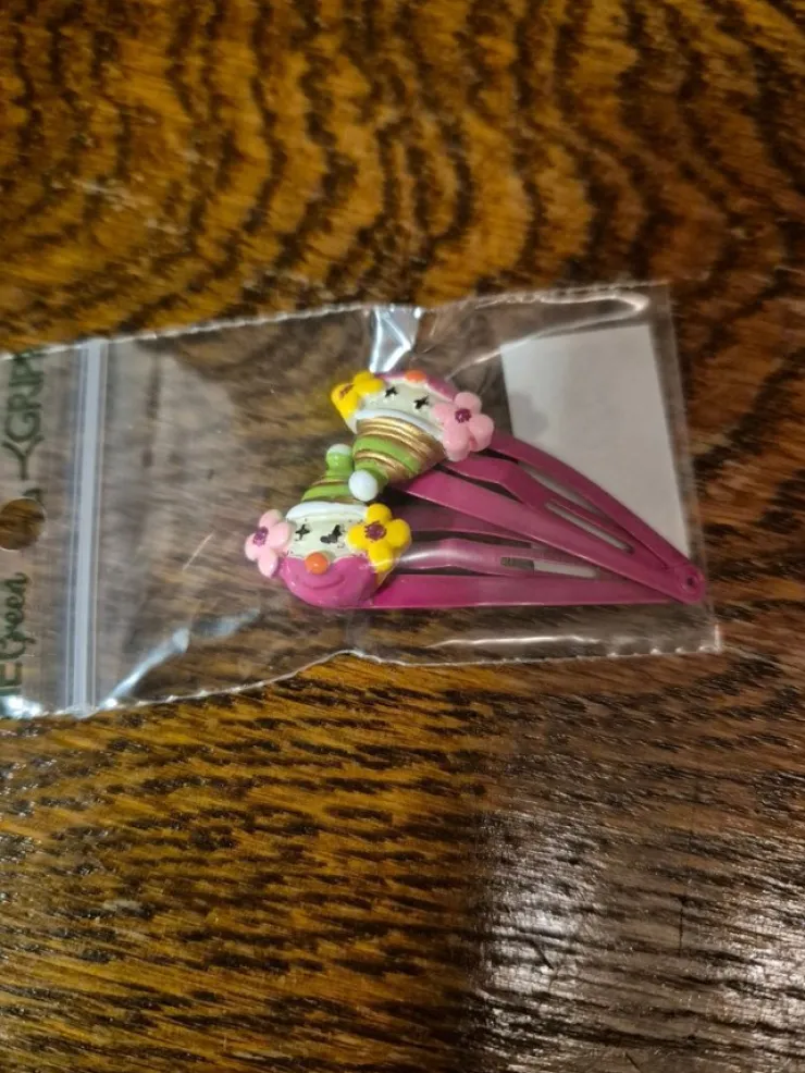 Säljer två söta hårklämmor med motiv av små figurer. Perfekt för att sätta upp håret eller som en fin detalj i håret.ca 4cm.