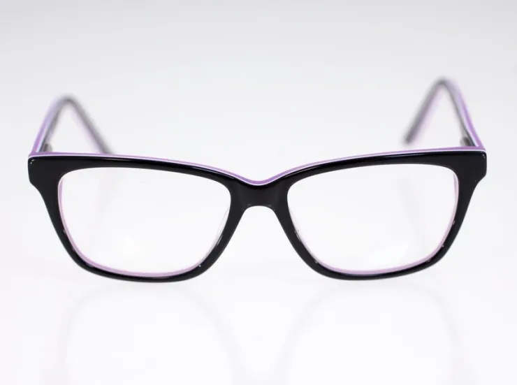 The eyeglasses have a black and purple colored double-layered plastic frame and arms fitted with prescription lenses