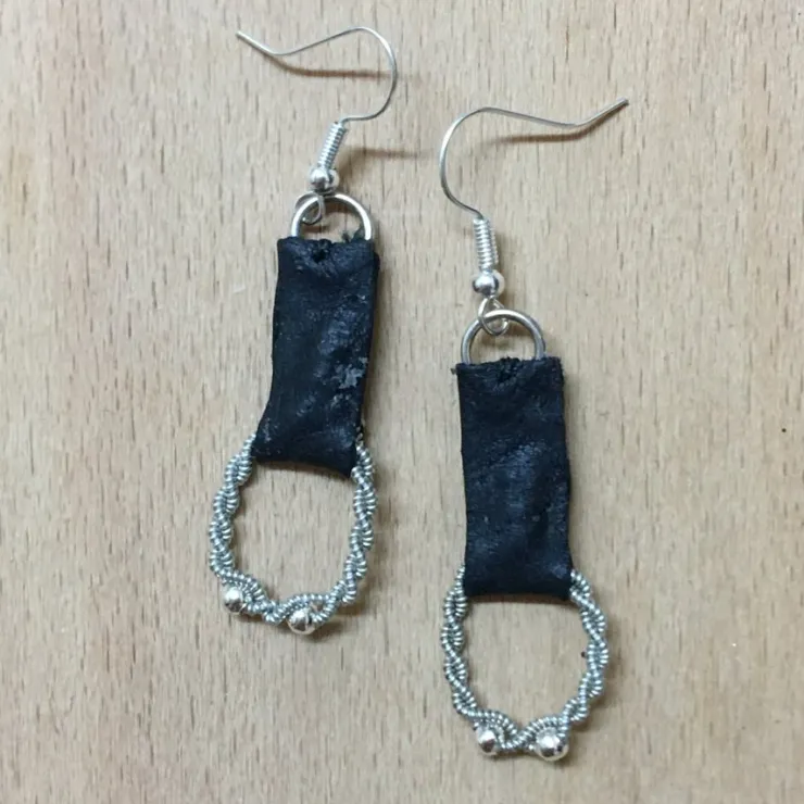 Handgjorda örhängen i äkta svart renskinn och tenntråd med 4 % silver (nickelfri).