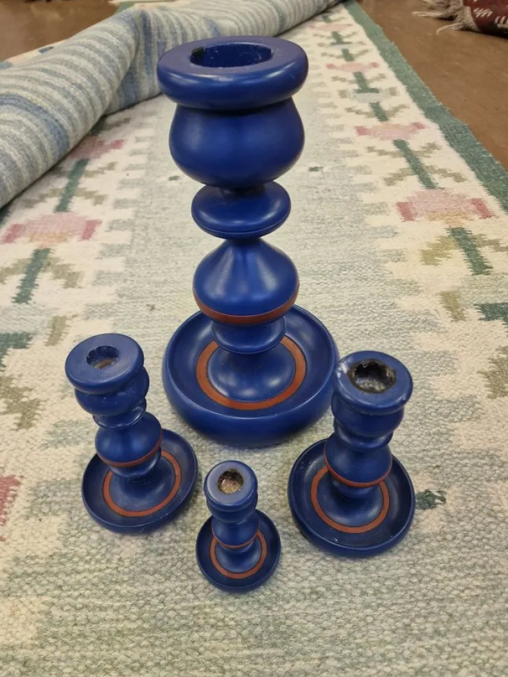 Snygg uppsättning ljusstakar i blått och brunt. Perfekt för att skapa en mysig atmosfär.