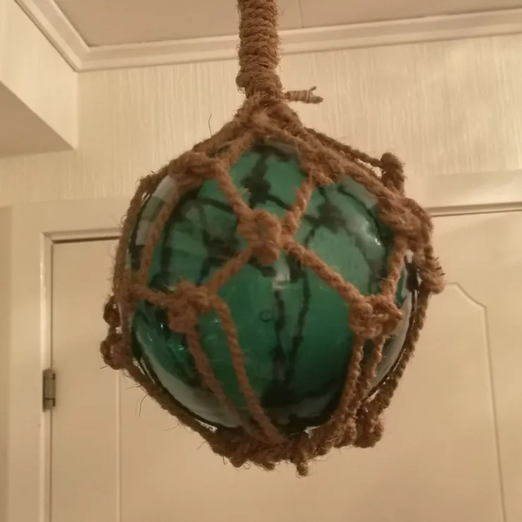 Gammal glasboj, grönt glas med PCF märke. 20cm bred o hög. Snörningen är nog omgjord någon gång med hampa snöre. Ca 40cm långt snöre för att hänga upp. Är i fint skick, se bilder.