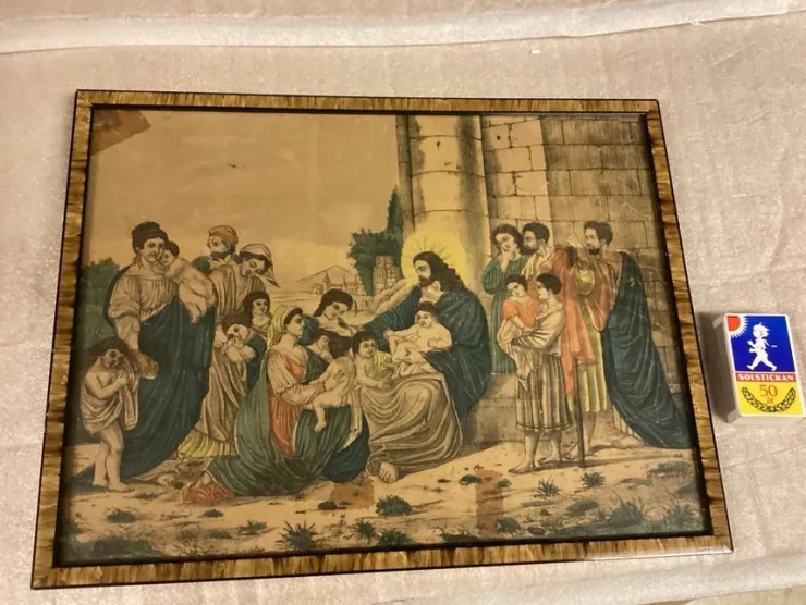 Gammal bild med religiöst motiv. Motivet föreställer Jesus med barn. Bilden är inramad.Rammått 26*34 cm