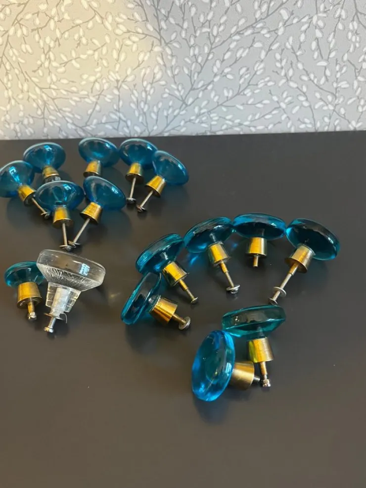 Hot Totalt 16st glasknoppar skåpsknoppar i blått & mässing bl.a Verrina Retro 60-tal Beslag & Reservedele