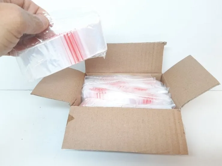 Du lägger bud på en hel kartong som innehåller totalt 1000 påsar (alltså 10 buntar med 100 påsar i varje bunt) av storleken 40x40 mm. Påsarna har en rödfärgad linje vid öppningen (se bilderna). Notera att pengarna på bilden endast är för visningssyfte och ingår inte i köpet.