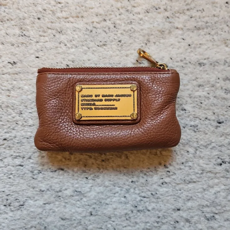 Marc Jacobs portmonnä i brunt 100% läder. Jag har använt den som en mindre plånbok då den rymmer både kort och mynt.