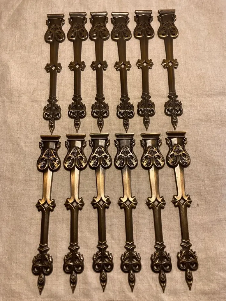 12 st snygga beslag. Längden på dem är 19 cm ( se bild 4 och 5 ). De här var fästa med små spik, jag skickar med de som finns kvar.