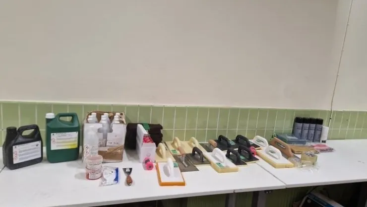 – Innehåll: Blandat byggmaterial och verktyg, inklusive fogplattor, tejp och kemikalier