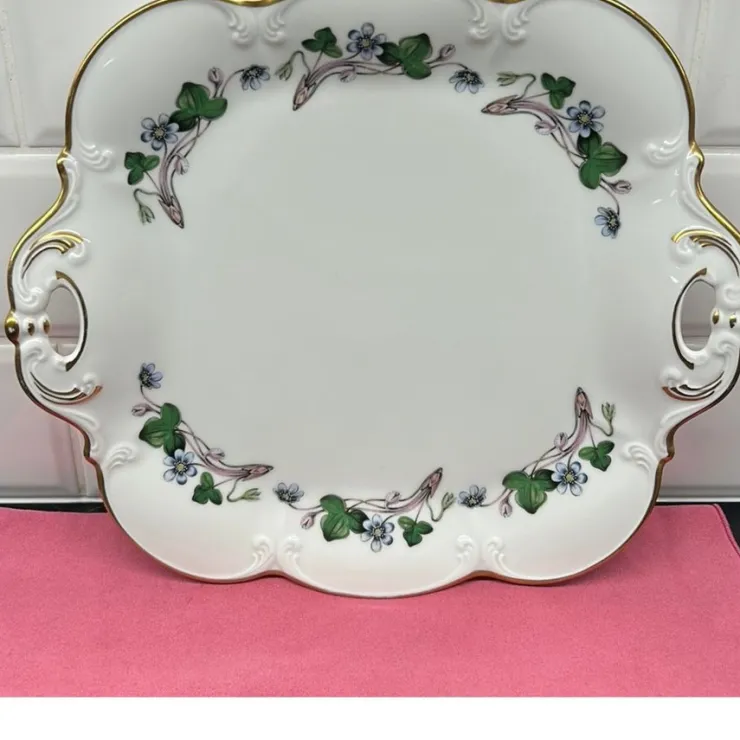 Fint serveringsfat från Hackfors Porslin med motivet Anemone Hepatica. Guldkant.