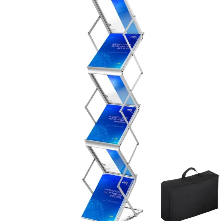 Detta broschyrställ med 6 fickor är perfekt för att visa upp broschyrer, kataloger, tidningar och reklammaterial på mässor, i butiker, kontor och väntrum. Den slitstarka metallramen och stabila designen säkerställer att materialet står stadigt och är lättillgängligt.
