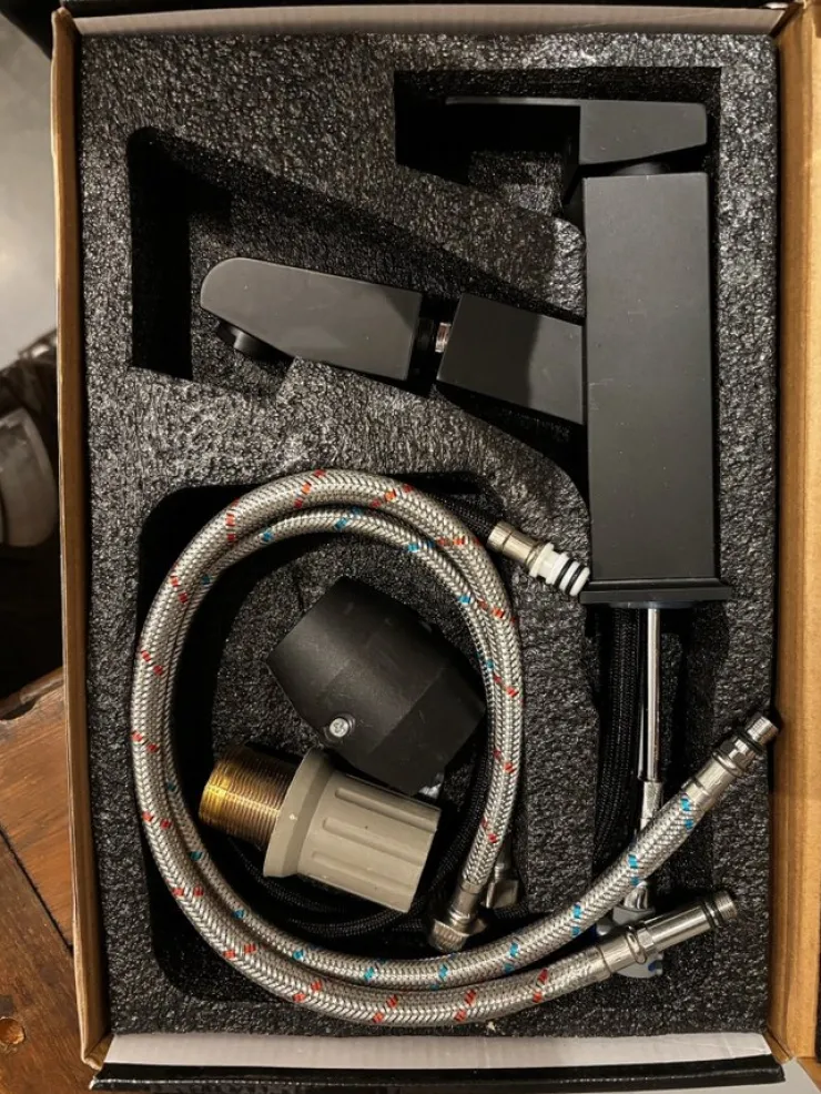 Ubrugt matsort blandingsbatteri til badeværelse i original emballage. Blandingsbatteriet er komplet med alt tilbehør, som vist på billedet. Blandingsbatteriet er fremstillet i plast.