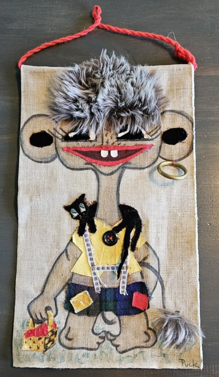 Troll Bonad i linnetyg, målad och med applikationer, pälshår, Signerad Puck. Örring i mässing.