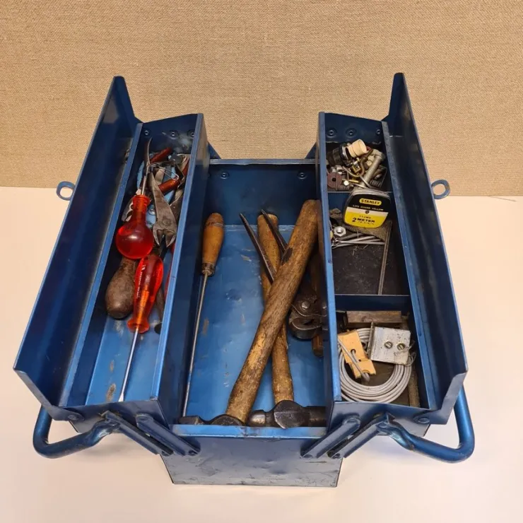 Værktøjskasse med div. værktøj bl.a. tænger, hammer mm. Målt værktøjskasse længde ca. 38,5, bredde 17, højde inkl. håndtag ca. 15 cm, totalvægt 5074 gram.