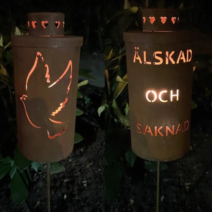 Gravlykta med dubbelsidigt motiv och text. Älskad och Saknad och på motsatta sidan en duva.