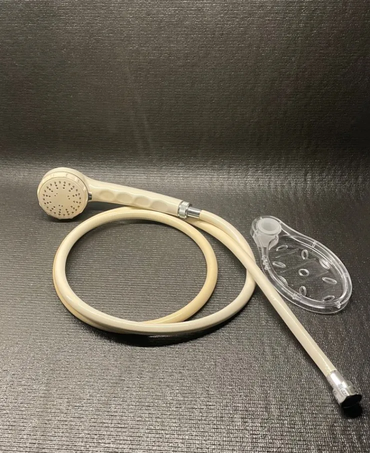 Bruserhoved med slange og sæbeskål til bruse stang. Bruserhovedet er justerbart og har vandbesparende funktion. Bløde gummidyser. Diameter på bruserhovedet er ca. 7 cm. God stand.