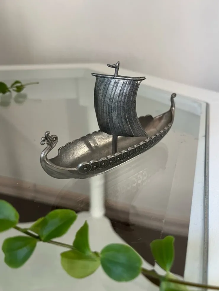 Söt liten tennbåt i form av ett vikingskepp från Sjögrens i Tomelilla. Båten är ca 12 cm lång och 6,5 cm hög. En charmig detalj för samlaren eller den historieintresserade. Märkt i botten. I jättefint skick. Väger 111g.
