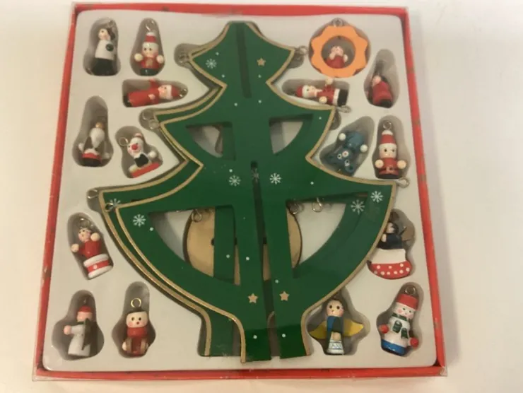 Äldre julpynt i trä, julgran med figurer att sätta ihop, figurerna hängs på i en krok, mått på asken är ca 20*20 cm.