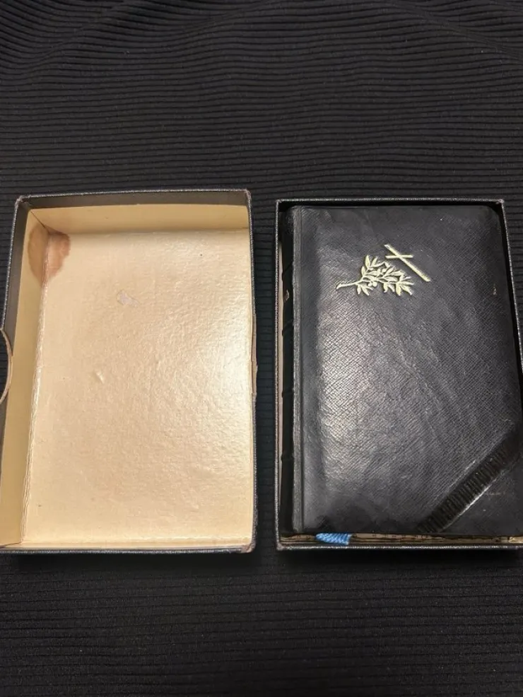 En gammal katolsk bönbok från 1800-talet. Boken är inbunden i svart läder med guldkanter och har ett blått band som bokmärke. Boken är i gott skick med tanke på sin ålder.