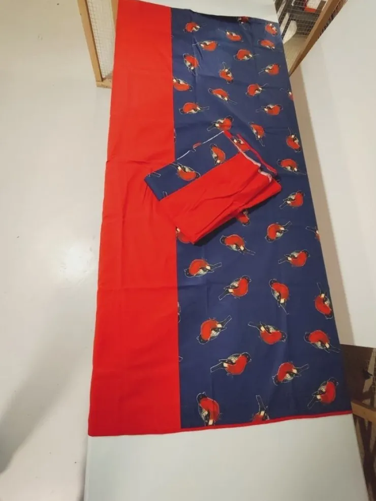 Två gardinlängder med domherrar som motiv. Ca 160 cm långa och ca 101 cm breda.