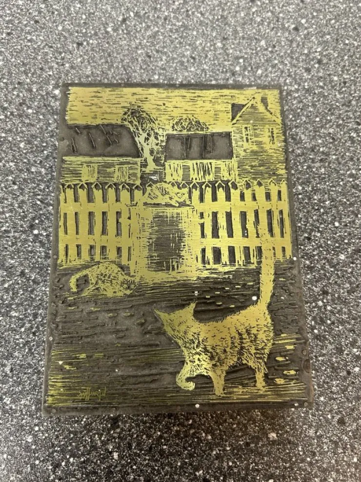 Gravyr stämpel med motiv av katter framför ett staket och ett hus. Gravyren är gjord i trä och har en guldfärgad yta.