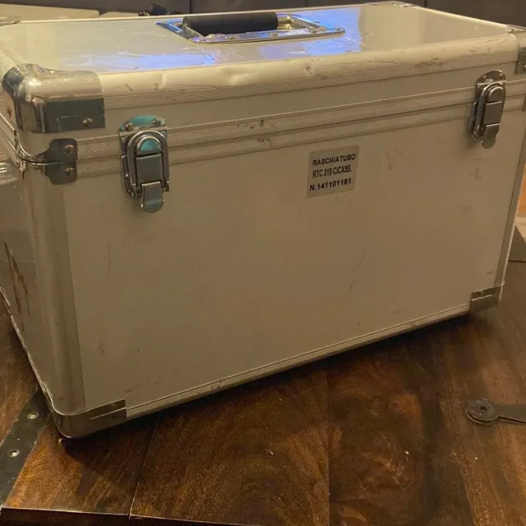 Sælger en metal opbevaringskasse. Der er nogle mærker og ridser. Men jeg tror, at det meste kan fjernes med stærkere midler. Så vidt jeg ved, er kassen til en rørskraber. Den kan dog bruges til andet. Sender gerne sammen