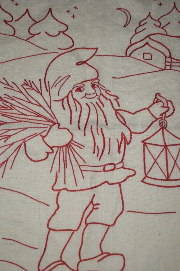 Store Tomte broderad i linne tyg, julbonad, väggbonad, retro, vintage, 60-tal, 70-tal Højtider
