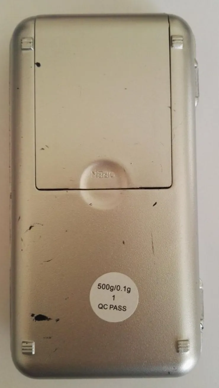 elektronisk köksvåg är använd och har skrapmärken på kroppen.