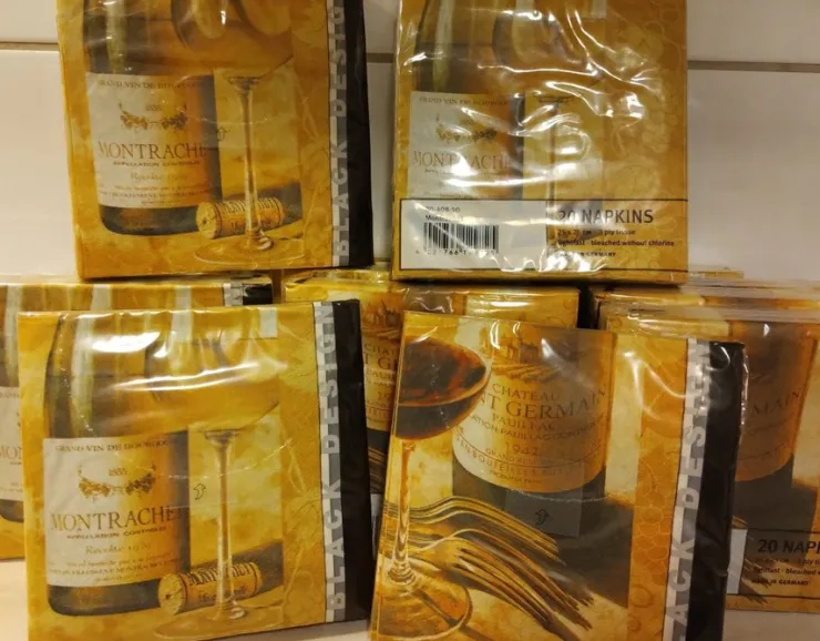 12 förpackningar vackra kvalitetsservetter i tre skikt. Det är 6 förpackningar med rött vin motiv och 6 förpackningar med vitt vin motiv.