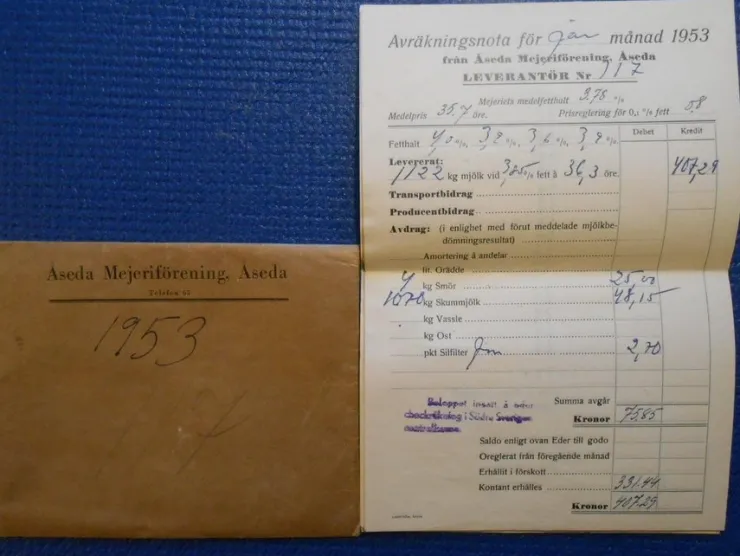 Tradera 12 st Avräkningsnotor mjölk Åseda Mejeriförening 1953 Januari-December> Kuriositeter