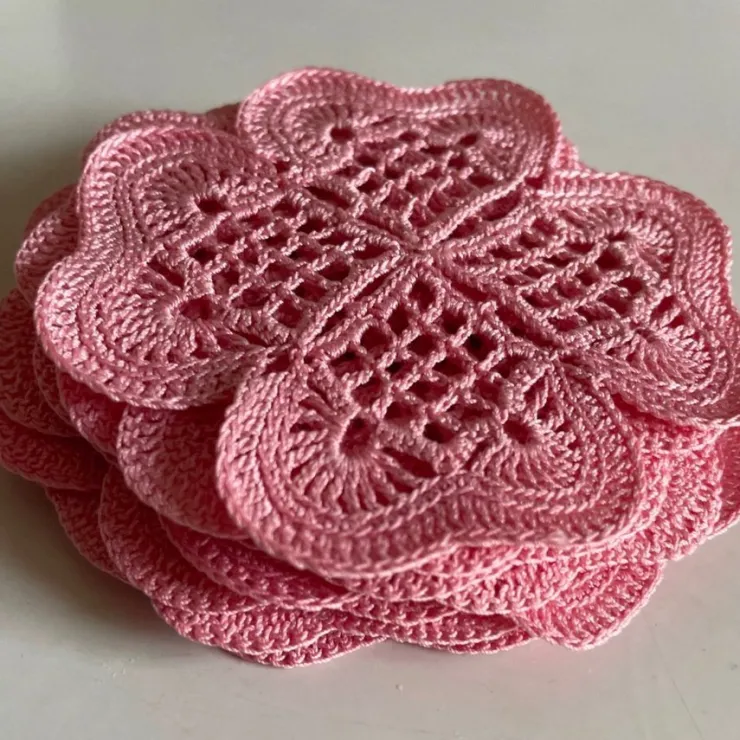 Snygga handgjorda virkade underlägg i rosa. Glasunderlägg. Underläggen är i en fin spetsdesign och är perfekta för att skydda dina bord och möbler. Ca 7-8 cm i diameter