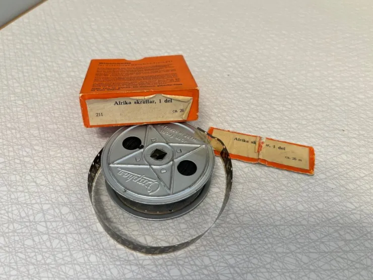 16 mm svartvit stumfilm med titeln "Afrika skrattar, del 1". Den kommer i en röd pappask med märket Ozaphan, som borde vara i två delar men som saknar yttre delen och har ett löst lock. Jag har rullat ut filmen ett par meter och försökt ta ett suddigt foto av innehållet. Samma titel som på asken återfinns bland de tidiga filmrutorna, så det är rätt film. Jag har ingen passande projektor, så jag har tyvärr inte kunnat testa den.