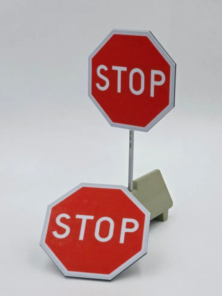 Två stycken stop-skyltar i skala 1/14. Perfekt för att skapa realistiska detaljer i din modellvärld.