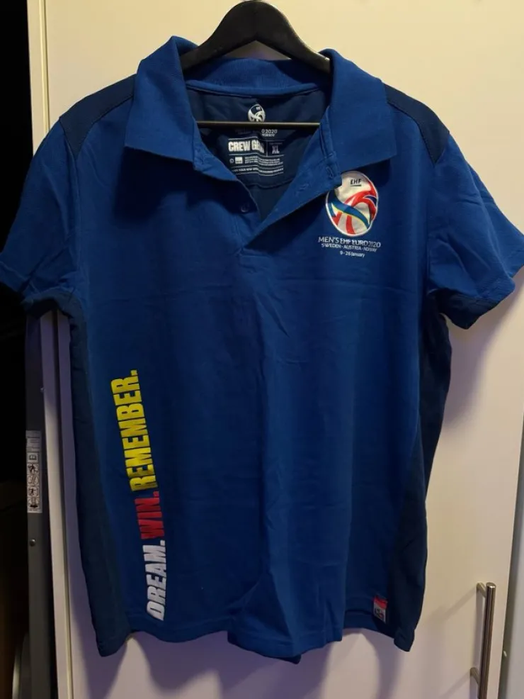 Snygg och officiell Crew-polo från Men's EHF EURO 2020 i Sverige, Österrike och Norge. Polotröjan är blå med gula och vita detaljer. XL-storlek. Baktill står det "CREW" med vita bokstäver. Perfekt för handbollssupportrar eller samlare.